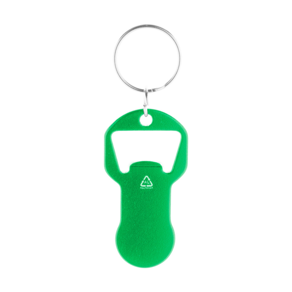 De Biropi groene flesopener-sleutelhanger is een handige, compacte accessoire vervaardigd uit gerecycled aluminium, uitgerust met een geïntegreerd winkelwagenmuntje. Ideaal voor dagelijks gebruik en onderweg.