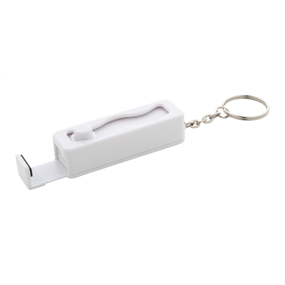 Witte, gerecycleerde ABS antistress fidget sleutelhanger met geïntegreerde mobiele houder en metalen ring. Ideaal voor onderweg om stress te verminderen en je smartphone handsfree te plaatsen.