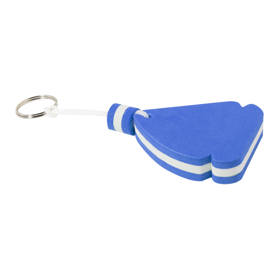 Zeilbootvormige drijvende sleutelhanger van EVA-schuim in blauw met metalen ring. Ideaal voor het identificeren van sleutels, tassen en andere persoonlijke spullen, vooral bij water- en buitenactiviteiten.