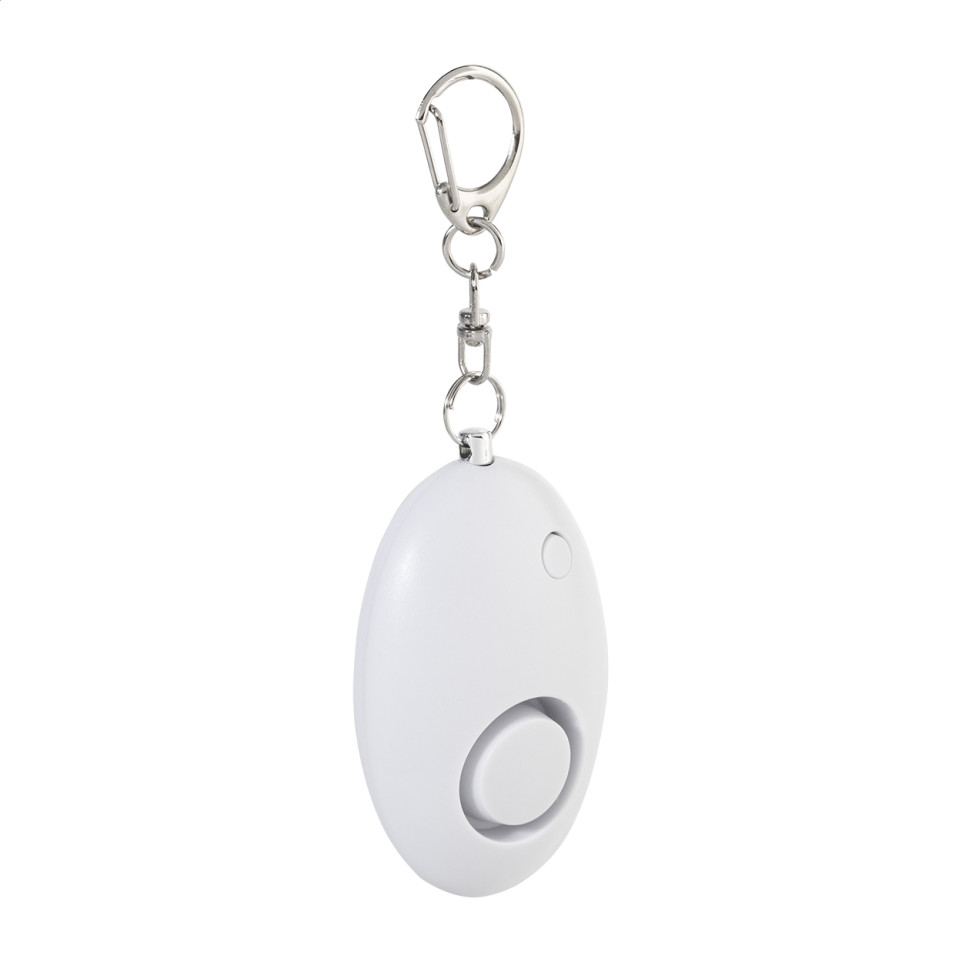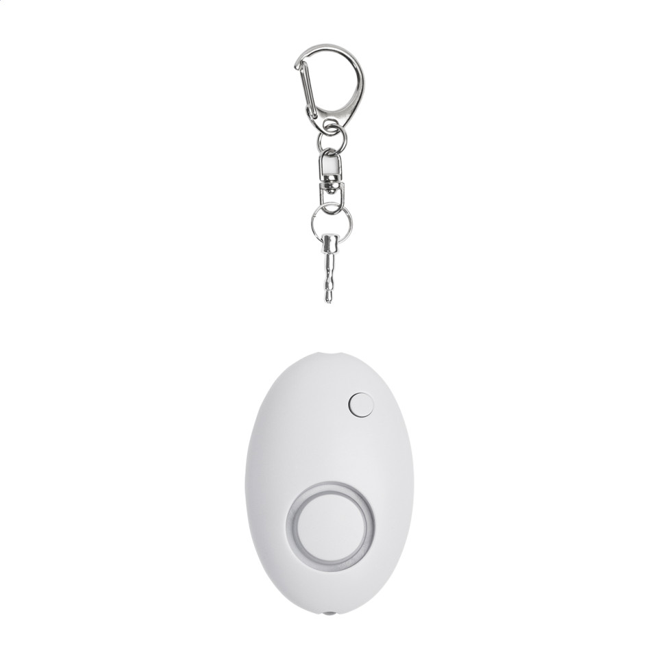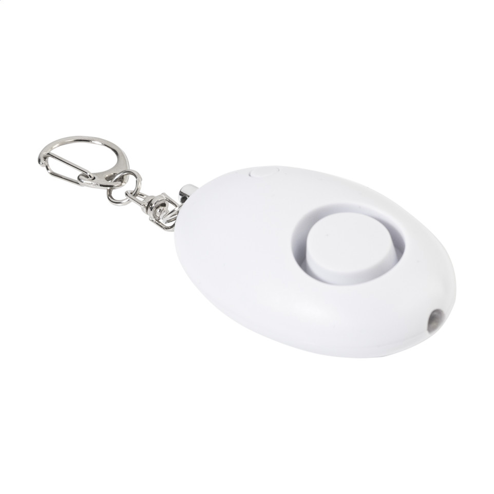 Compacte persoonlijke alarmsleutelhanger in gerecycled ABS met een geïntegreerde LED-zaklamp en metalen karabijnhaak, ontworpen voor dagelijkse veiligheid onderweg.