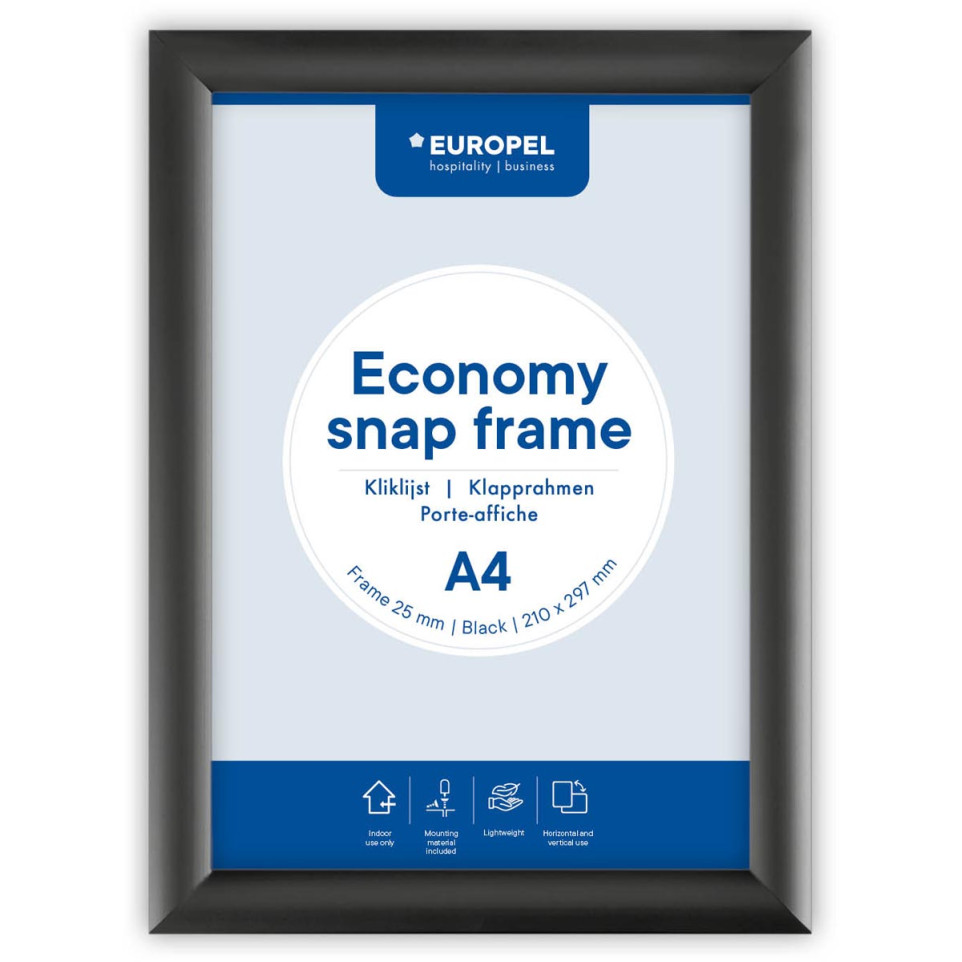 De Europel clicklijst Economy is een veelzijdige posterhouder in zwart, geschikt voor A4-formaat posters. Ideaal voor het tonen van informatie, campagnes of mededelingen op kantoor, in winkels of openbare ruimten.