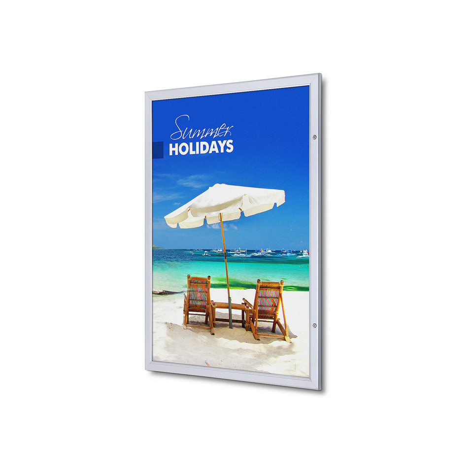 Plaats de poster in de houder door de deur te openen via het zijscharnier. Sluit vervolgens de deur af met een sleutel om je poster veilig tentoon te stellen.