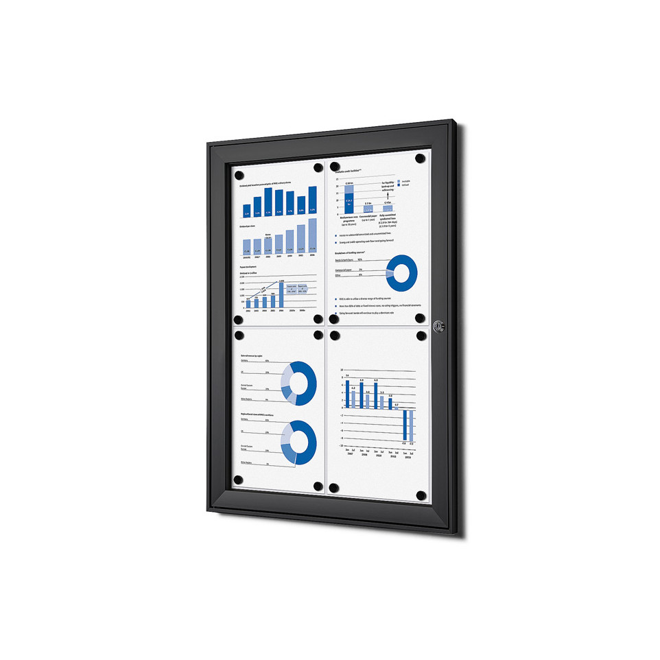 Vergrendelbaar notitiebord voor binnengebruik in zwart, geschikt voor het presenteren van maximaal vier A4-formaten. Ideaal voor gebruik in kantoren, scholen, openbare ruimten of bedrijfsentrees waar mededelingen veilig en overzichtelijk moeten worden getoond.