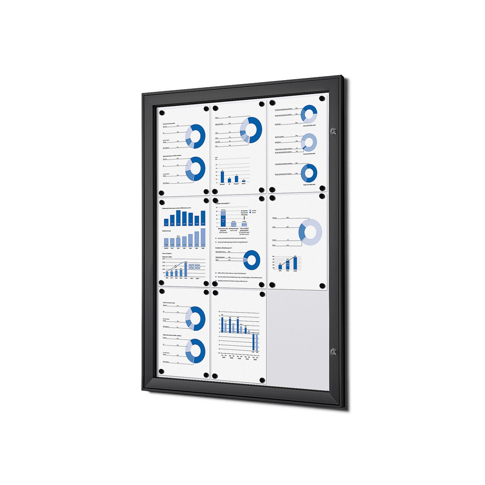 Vergrendelbaar notitiebord voor binnengebruik, afgewerkt in zwart, geschikt voor het tonen van maximaal 9 A4-posters. Ontworpen voor overzichtelijke, georganiseerde presentatie van informatie of mededelingen in kantoren, scholen of openbare gebouwen.