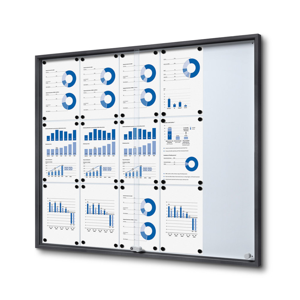 Het Vergrendelbaar Notitiebord Met Schuifdeuren Slim 15 x A4 Antraciet is ideaal voor gebruik in scholen, kantoren of openbare ruimtes om informatie overzichtelijk en veilig te presenteren.
