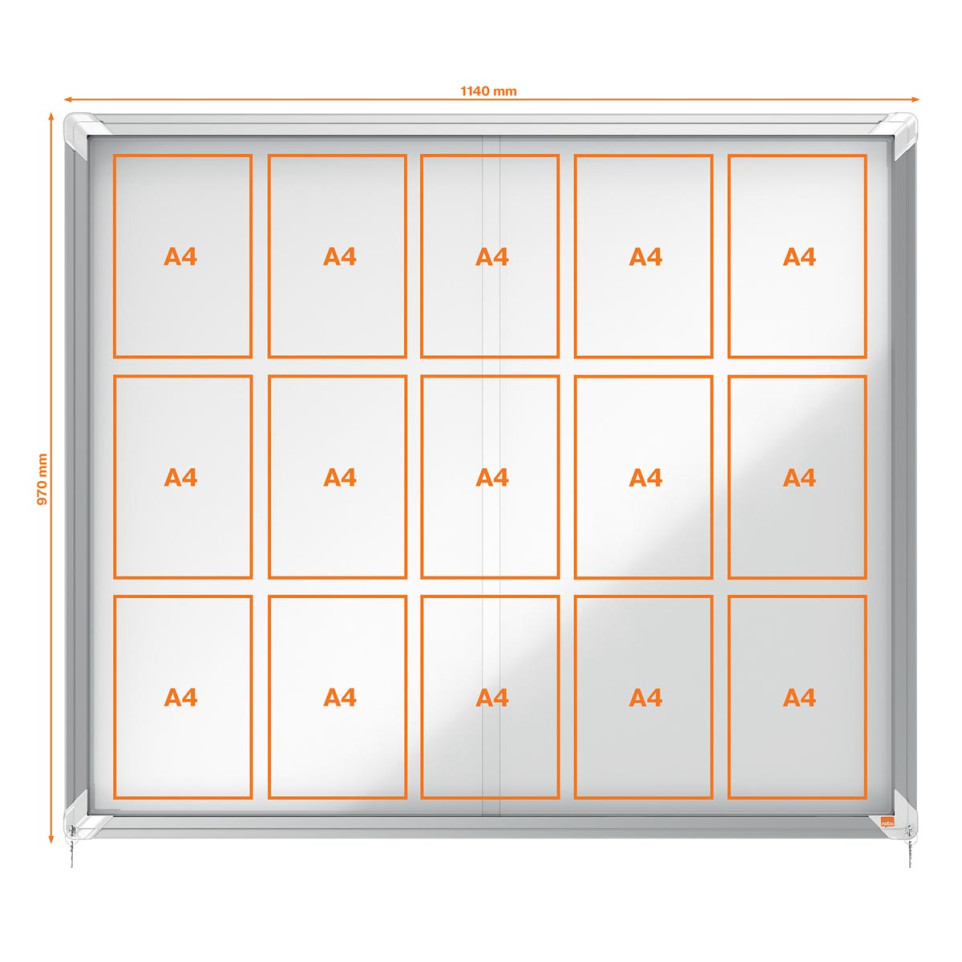 De Nobo Premium Plus binnenvitrine is een ruime, afsluitbare vitrine voor binnengebruik met schuifdeuren en hoekslot. Geschikt voor het overzichtelijk presenteren van maximaal 15 A4-posters of documenten in kantoren, scholen of openbare ruimten.