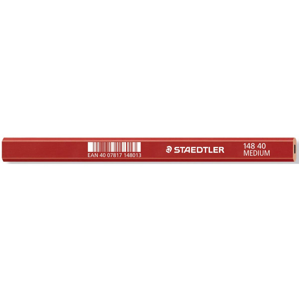 Staedtler timmermanspotlood van 175 mm met medium hardheid, ideaal voor het nauwkeurig aftekenen op hout, steen, beton en andere bouwmaterialen. De opvallende rode kleur en de ovale vorm maken het potlood praktisch in elk project.