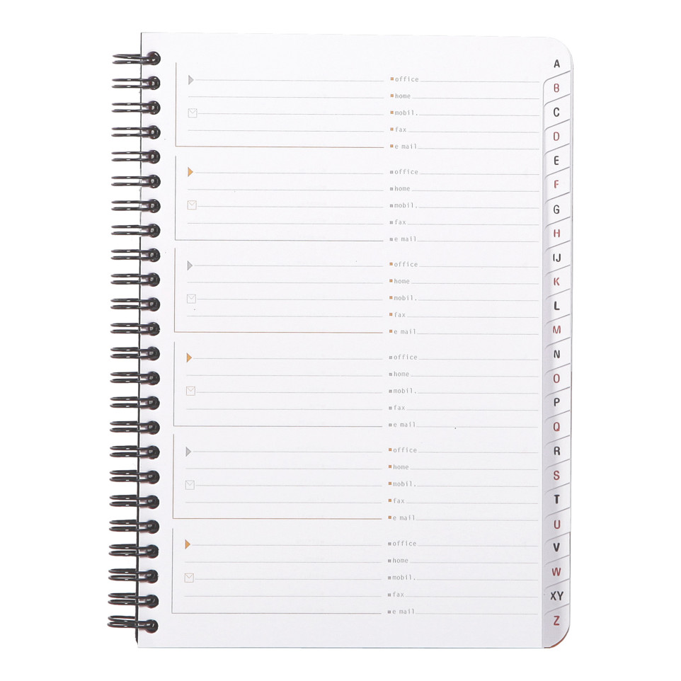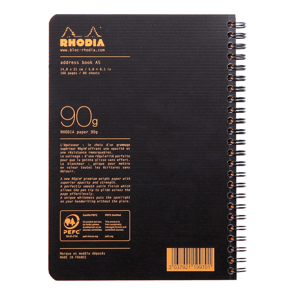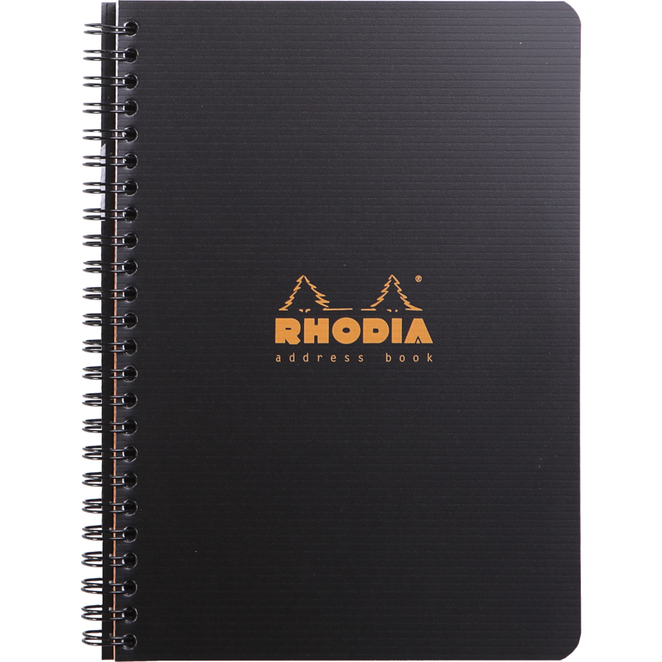 Rhodiactive adresboek 90g, spiraalgebonden repertorium A5, 80 voorbedrukte bladen, zonder microperfatie, met insteektas Het authentieke en originele karakter van de Rhodia-blokken vind je ook terug in deze praktische en functionele notitieboeken met sp iraalbinding. Laat u overtuigen door het uitmuntende 90g papier, met zijn unieke witheid, perfecte satijnglans, superieure opaciteit en duurzaamheid. Omslag in gerecycled polypropyleen. 80 microgeperforeerde en voorbedrukte bladen met glanzende tabs. Met 1 kartonnen insteektas voor het opbergen van documenten.