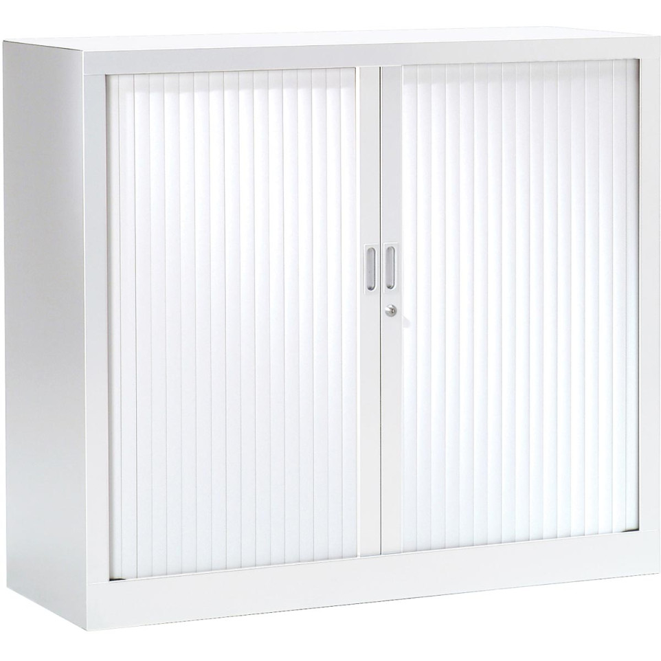 Deze roldeurkast met een hoogte van 100 cm en een witte afwerking is ideaal voor het opbergen van kantoorbenodigdheden en documenten in werkruimtes waar efficiëntie en overzicht centraal staan.