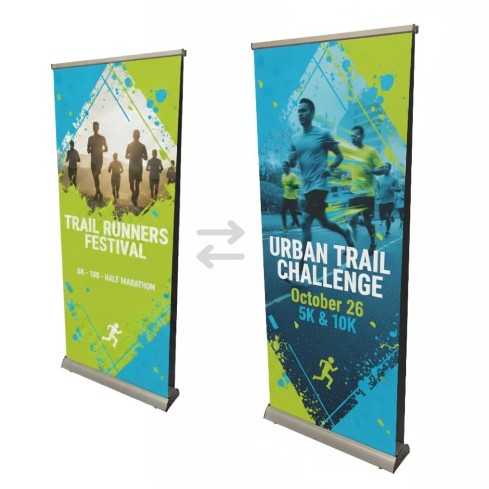 Rollup 85x200 voor tweezijdig gebruik met bedrukte beelden.