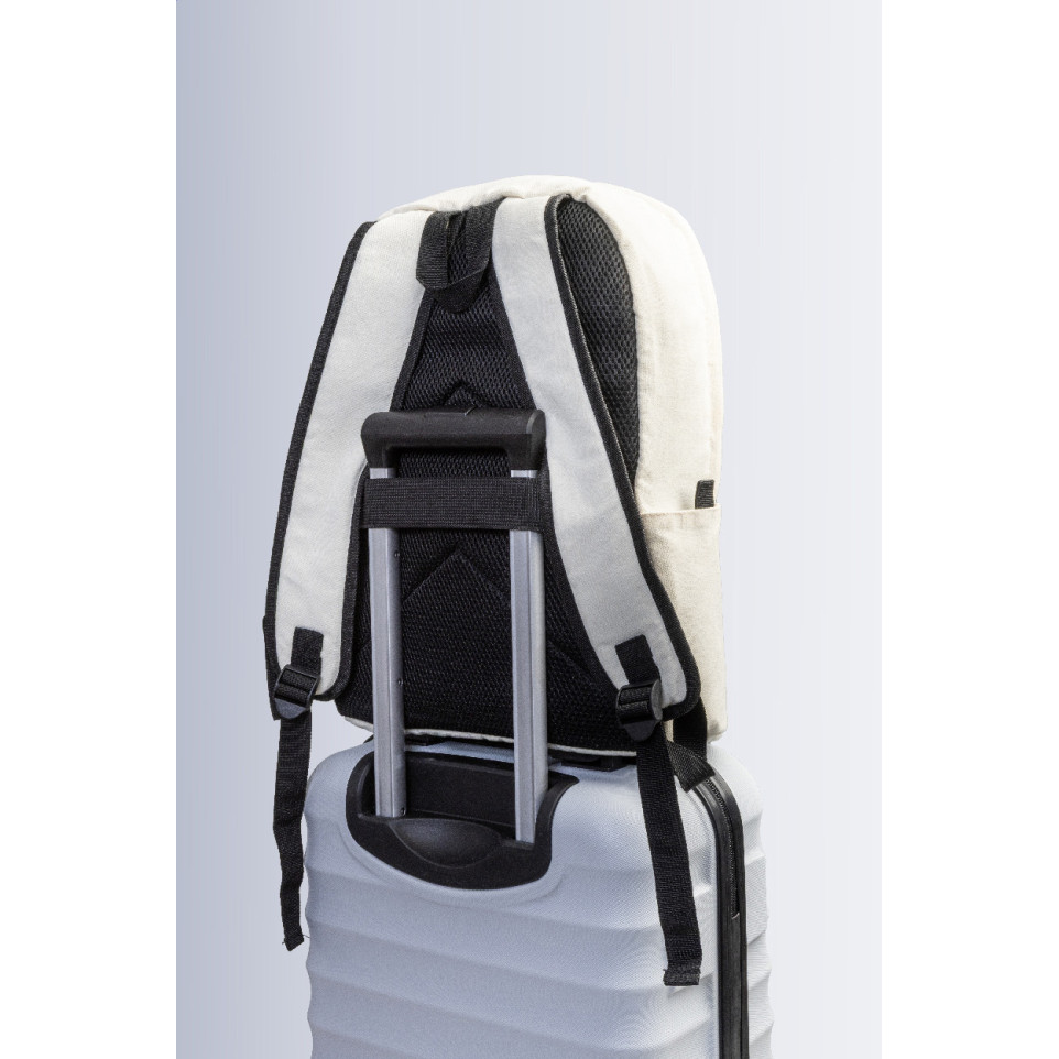 Stijlvolle gerecyclede canvas rugzak met ruim hoofdvak met rits, speciaal gewatteerd laptopvak voor 15" laptops, twee handige ritsvakken aan de voorkant, zijvakken en een trolleylus. Ideaal voor dagelijks gebruik, werk, of reizen.