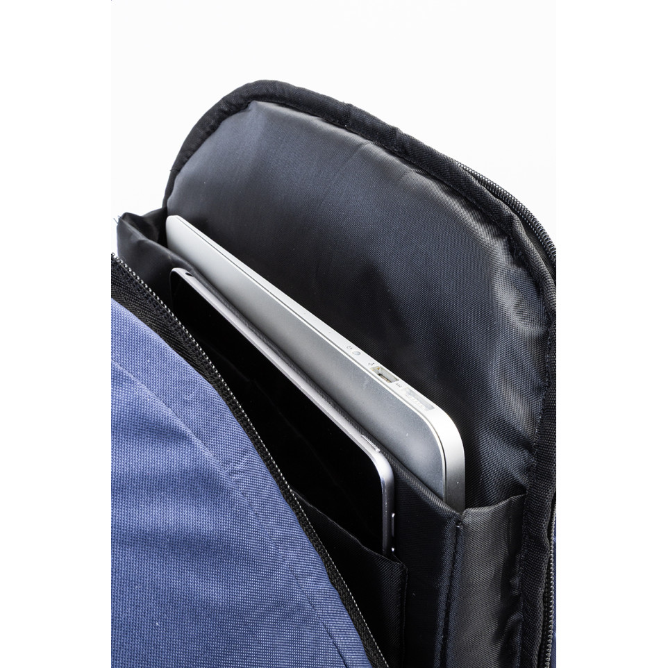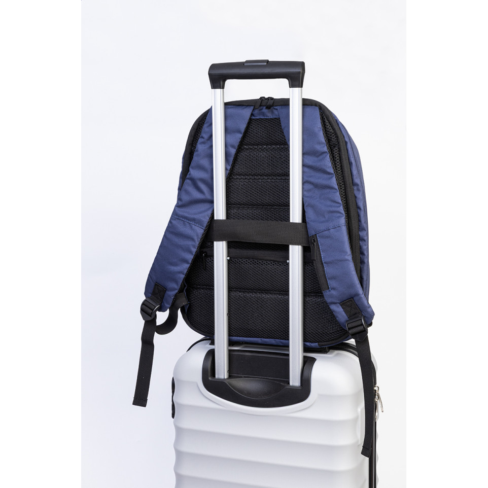 De Leland donkerblauwe RPET rugzak is een anti-diefstal model voor dagelijks gebruik, zoals woon-werkverkeer of reizen. Hij biedt gewatteerde compartimenten voor een 15" laptop en 12" tablet, plus een ritsvak en trolleyband.