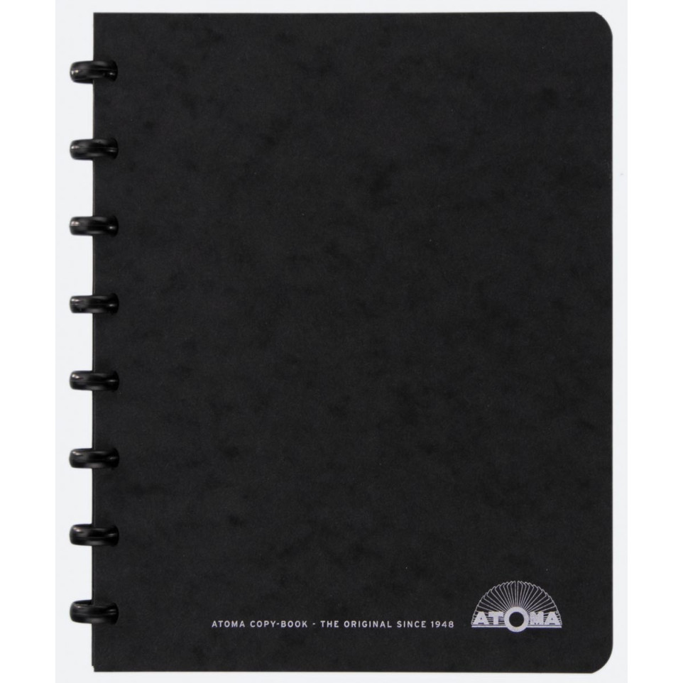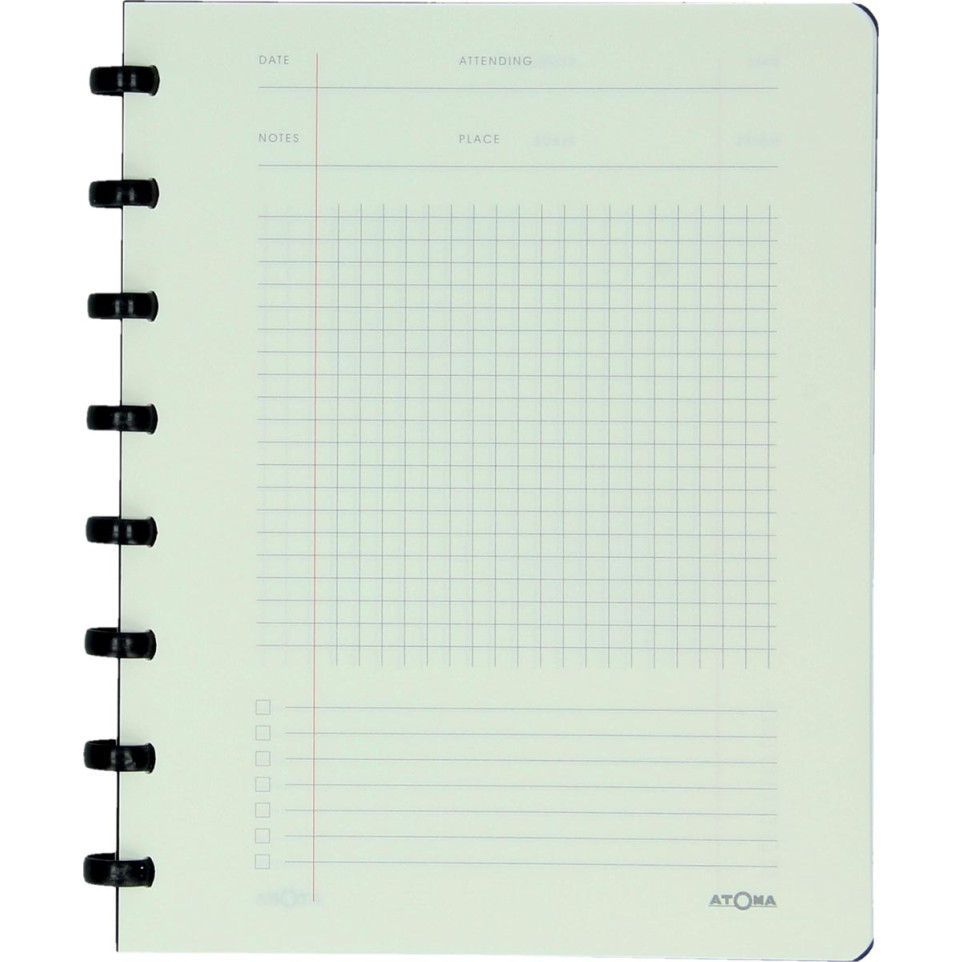 De Atoma meetingbook is een praktisch en compact notitieboek dat ideaal is voor zakelijke bijeenkomsten en vergaderingen. Het A5-formaat zorgt ervoor dat het makkelijk in een zak of tas past, terwijl de geruite zwarte kaft een professionele uitstraling heeft. De 5mm-geruite kaft biedt een goede grip en voorkomt dat het boek gemakkelijk openvalt.