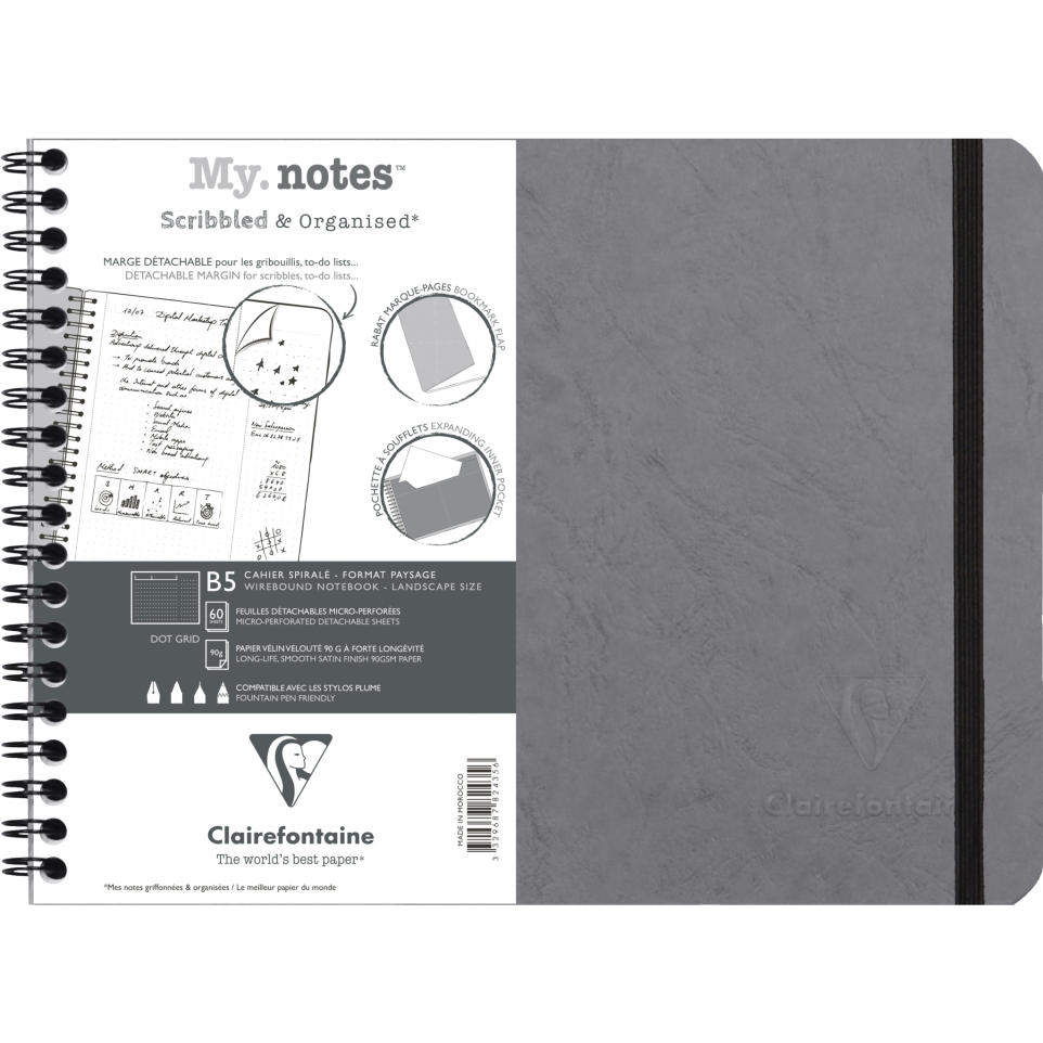 My.Notes Age Bag cahier reliure intégrale à marges détachables B5 paysage 120 pages détachables DOT + cadre en-tête Le cahier à marges détachables, pour griffonner plus malin et organisé : griffonnez dans la marge (un numéro de téléphone lors d'un appel, des calculs ou des dessins pendant une réunion, voire vos to-do lists), puis détachez-la facilement, pour ne conserver que l'essentiel de vos notes au propre sur l'autre partie de la page ! Un rabat marque-page à l'avant + une pochette de rangement à soufflets à l'arrière. Fermeture par élastique assorti à la couverture. Collection AGE BAG, authentique et intemporelle. Au quotidien ou en voyage au bout du monde, les cahiers Clairefontaine AGE BAG recueillent vos pensées où que vous soyez. Envie d'évasion ou simplement d'authenticité ? Emportez-les partout avec vous ! Couverture en carte teintée dans la masse imitant le grain du cuir : durable et résistante ! Papier Clairefontaine Vélin Velouté 90 g, pour une sensation de glisse unique, fabriqué en France et certifié PEFC, pour la gestion durable des forêts. Produit façonné à la main.