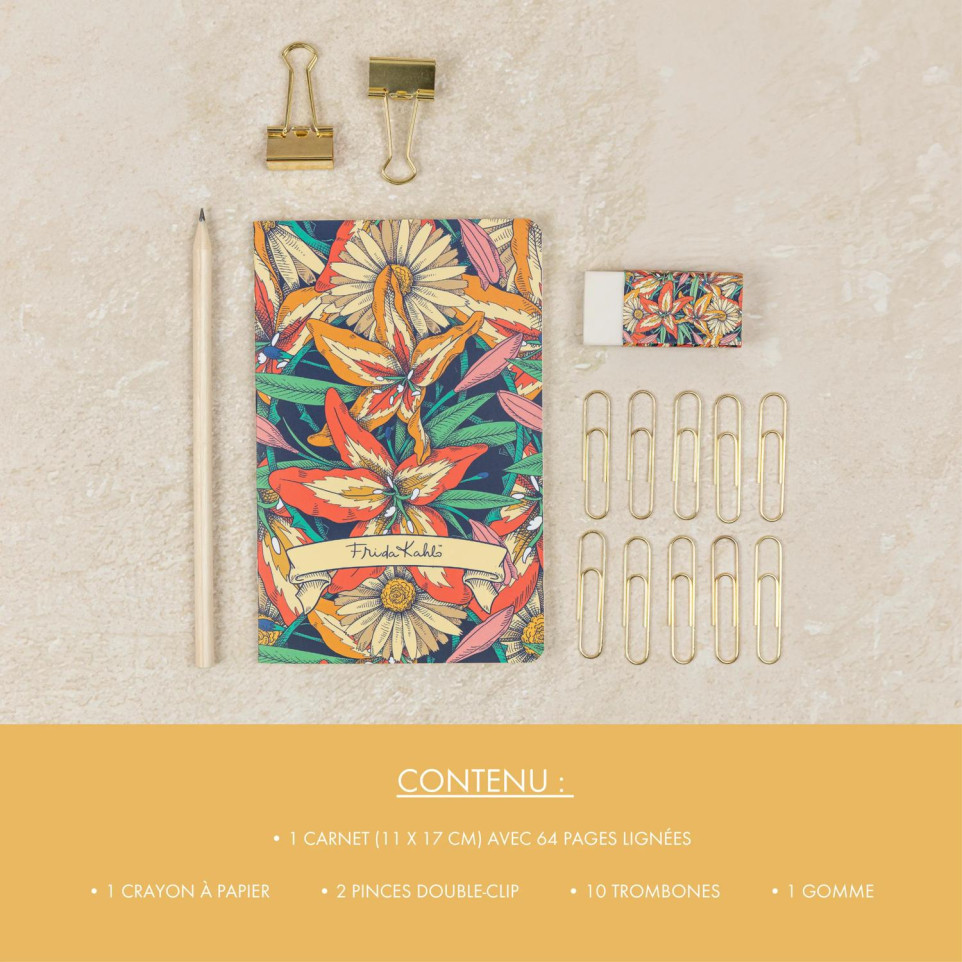 Frida Kahlo, schrijfwarenset met een notitieboek 11x17 cm, 64 gelijnde pagina's, een potlood, 2 dubbele klemmen, 10 paperclips en een gum Ik schilder bloemen zodat ze niet verdwijnen. Frida Kahlo (1907 - 1954) Duik in de levendige en inspirerende wereld van Frida Kahlo met onze collectie die deze iconische artieste eert. Passioneel, creatief, tijdloos en uniek Frida is een legendarische figuur in de kunst en vrijheid van expressie. Deze collectie viert haar kracht, veerkracht en de schoonheid van haar werk, waarbij elke creatie de gedurfde geest en eindeloze creativiteit van de Mexicaanse artieste weerspiegelt. De designs, met kleurrijke bloemenmotieven, stralen de energie en passie van Frida Kahlo uit, en brengen de weelderige natuur tot leven die haar omringde en haar verbeelding voedde. Het is een uitnodiging om je ideeën, dromen en inspiratie vast te leggen op stukken die nooit zullen verwelken ter ere van een artieste wiens ziel de wereld blijft fascineren en inspireren. Inhoud set: Notitieboek van 11x17 cm met 64 gelijnde pagina's, een potlood, 2 goudkleurige dubbele klemmen, 10 goudkleurige paperclips en een gum. Deze compacte schrijfset bevat alle essentials om georganiseerd te blijven en stijlvol notities te maken. Het perfecte cadeau om te geven of jezelf cadeau te doen. De kwaliteit en gladheid van het fluweelzacht Clairefontaine 90g ivoorkleurig velijnpapier, PEFC-gecertificeerd en geproduceerd door Clairefontaine in de Vogezen.