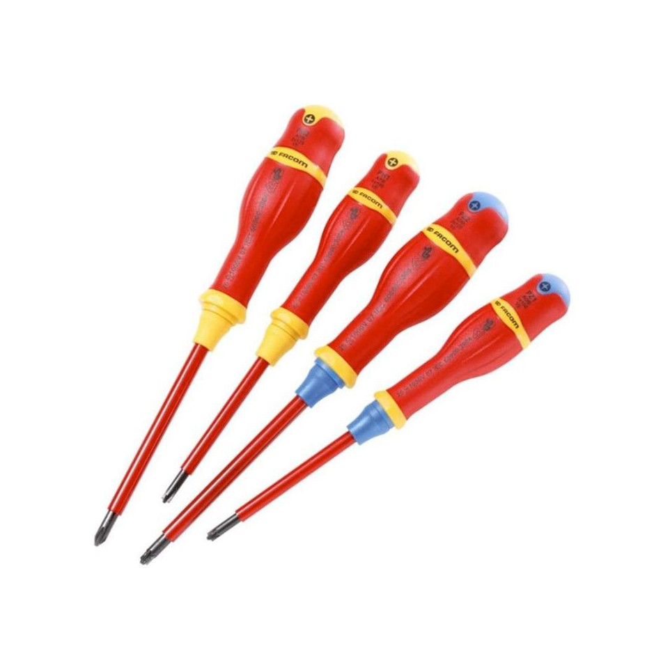 De Facom Borneo set van 4 geïsoleerde schroevendraaiers is ontworpen voor veilig elektrisch werk aan schakelaars, relais, stroomonderbrekers, aansluitdozen en klemmenblokken. Speciaal geschikt voor zowel professionele monteurs als doe-het-zelvers.