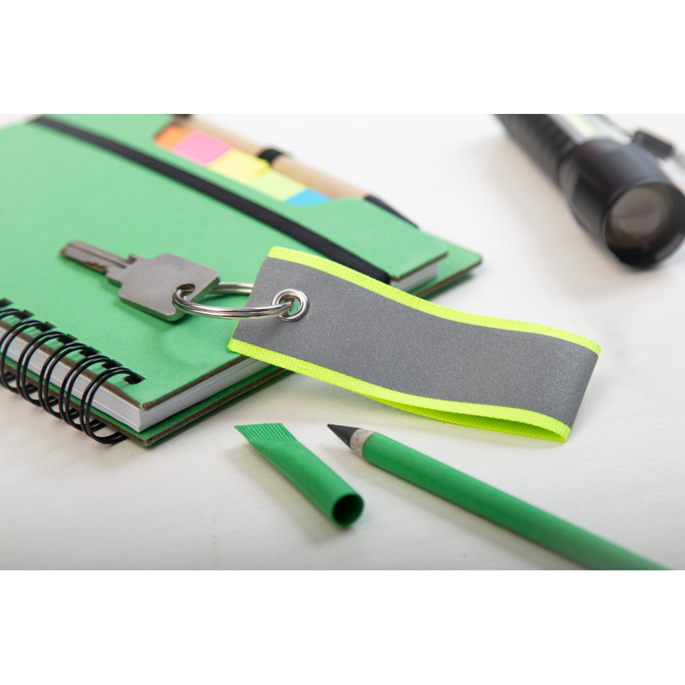 De sleutelhanger is vervaardigd van reflecterend kunststof, een polyester band en een metalen ring.