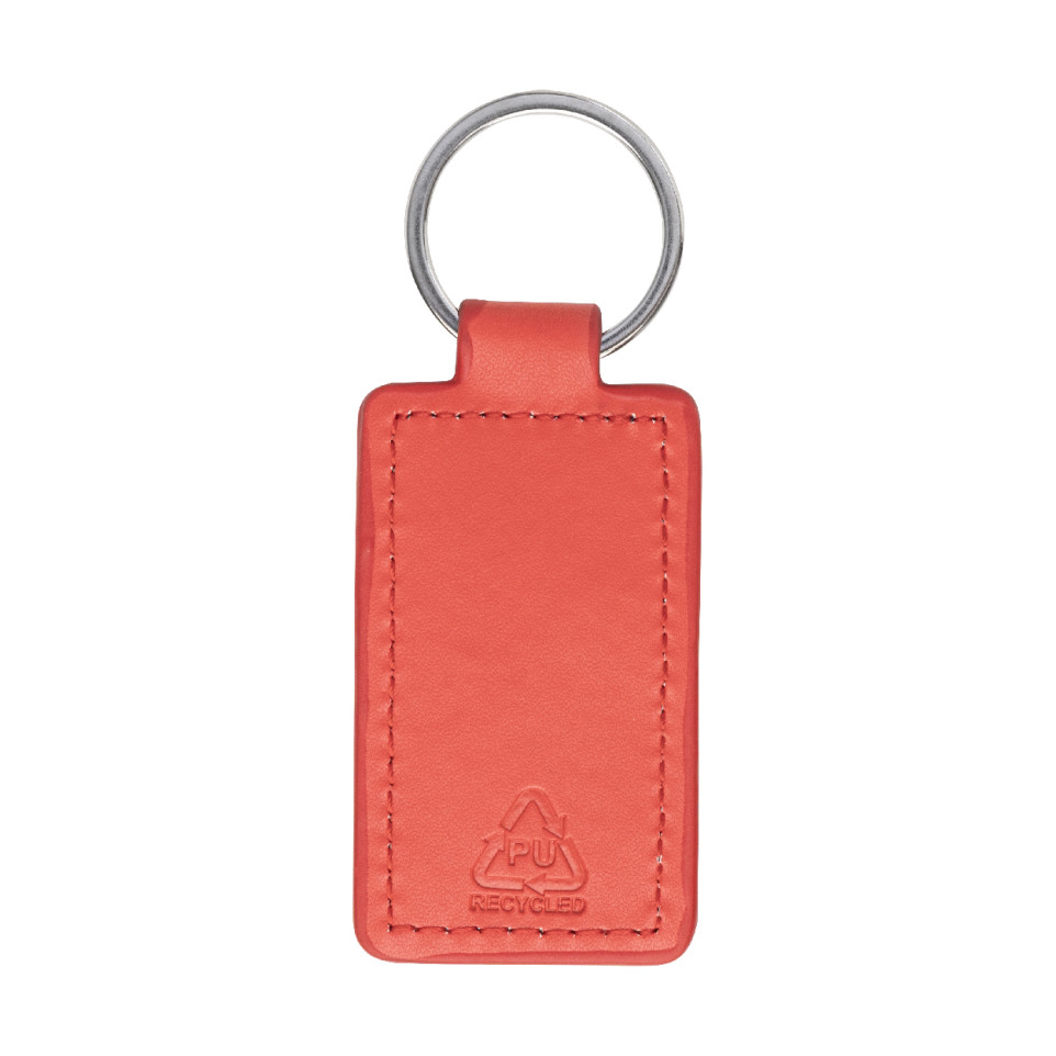 Rechthoekige, rode sleutelhanger van gerecycled PU-leer met een metalen ring en roestvrijstalen logoplaat met rubberen afwerking. Ideaal voor dagelijks gebruik aan sleutelbos, tas of lanyard.