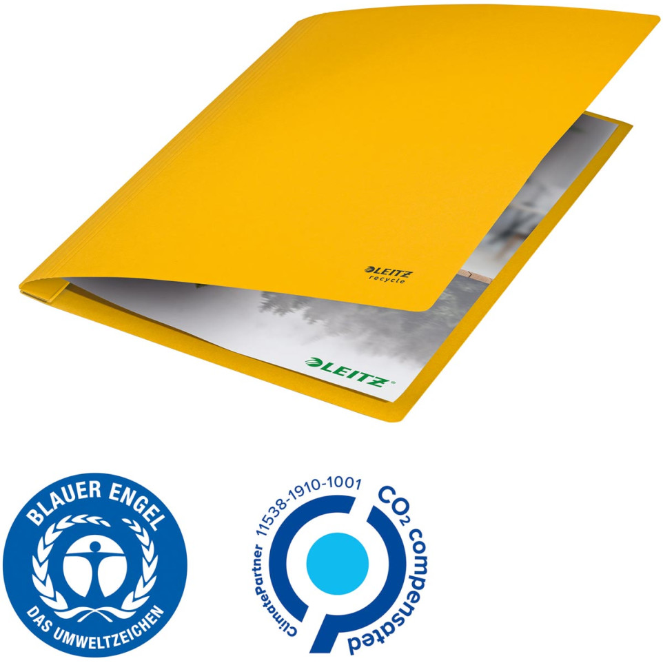 De Leitz Recycle offertemap is een gele snelhechtmap van karton, geschikt voor documenten op A4-formaat. Ideaal voor het bewaren en ordenen van offertes, rapporten of presentaties op kantoor, school of thuis.