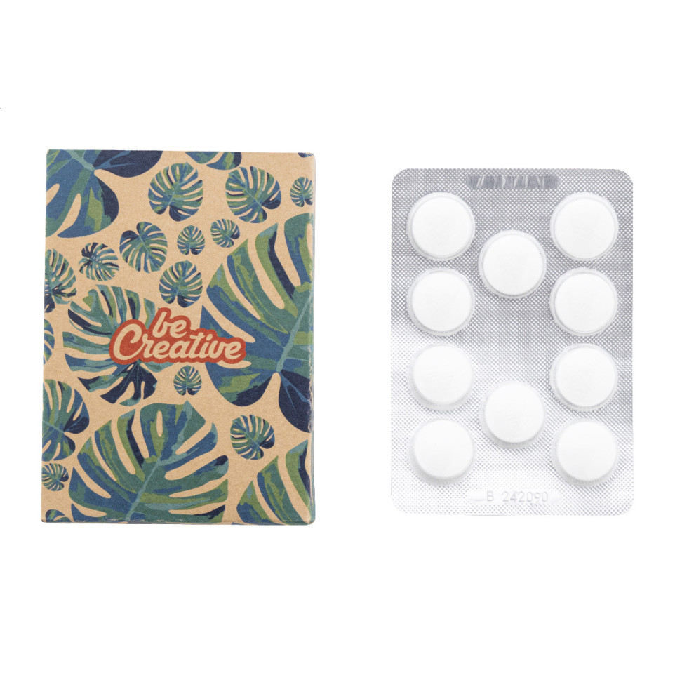 10 grote muntsnoepjes in een praktische blisterverpakking, verpakt in een natuurlijk gekleurde kraftpapierdoos met full colour bedrukking. Ideaal voor promotionele doeleinden, events of als give-away. Minimale afname: 100 stuks.