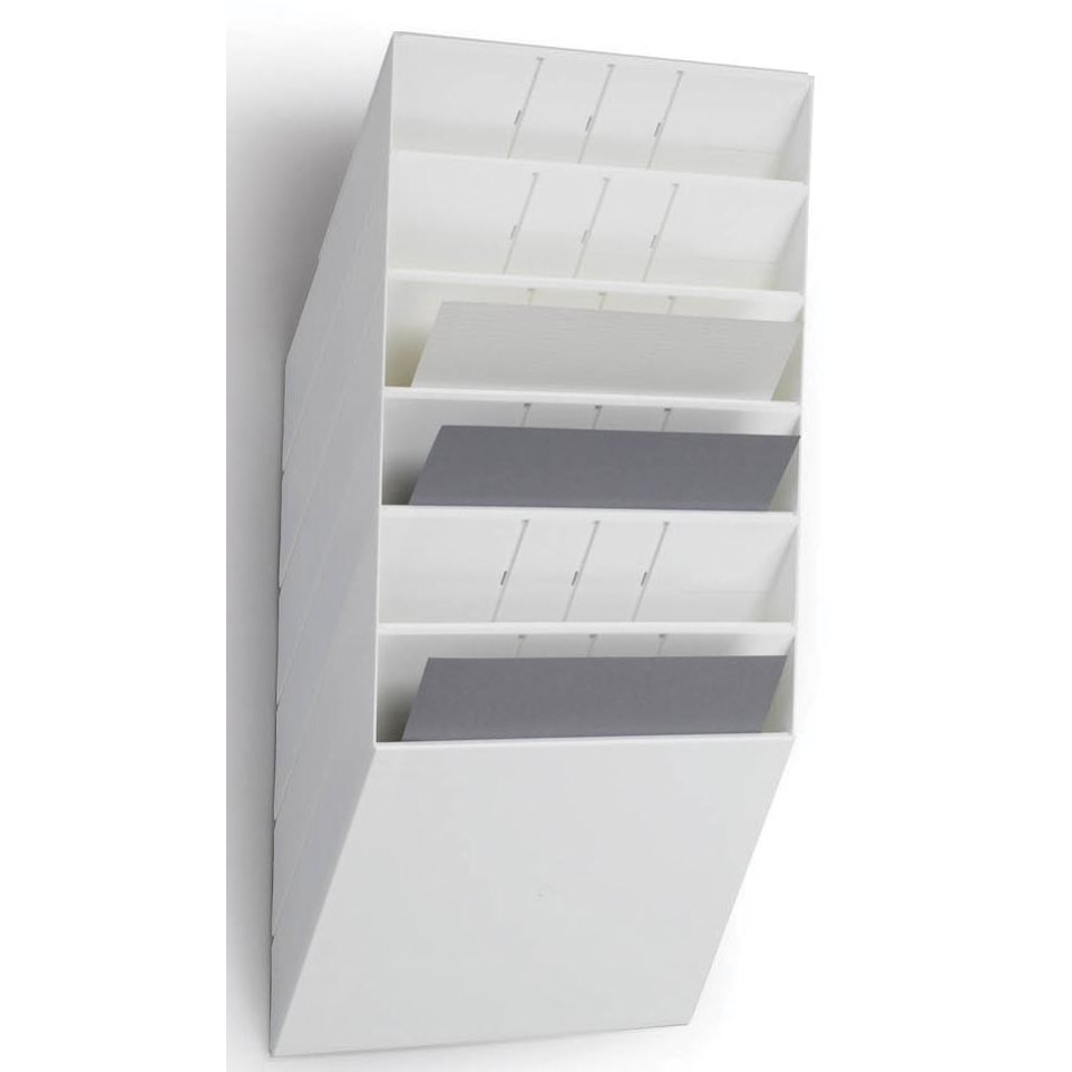 Folderhouder in wit kunststof met eenvoudig design, geschikt voor het overzichtelijk presenteren en aanbieden van liggende A4-documenten. Beschikt over 6 horizontale vakken en is ontworpen als muurmodel met een heldere frontplaat, ideaal voor gebruik in kantoren, wachtruimtes of openbare ruimtes.