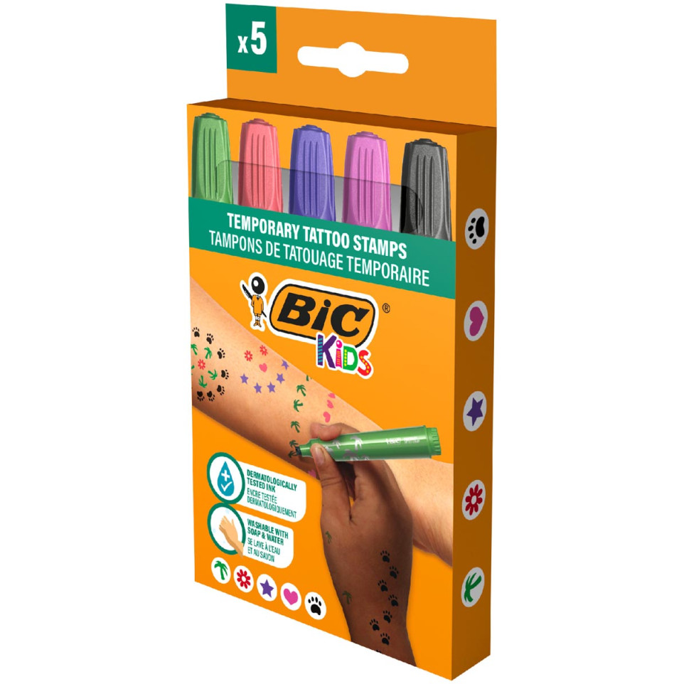 Bic Kids tijdelijke tattoo stempels, set van 5, zijn ontworpen voor creatief gebruik door kinderen. Ideaal voor feestjes, knutselmiddagen of als leuke beloning. Elke stempel geeft een heldere tijdelijke tattoo in een van de vijf vrolijke kleuren.