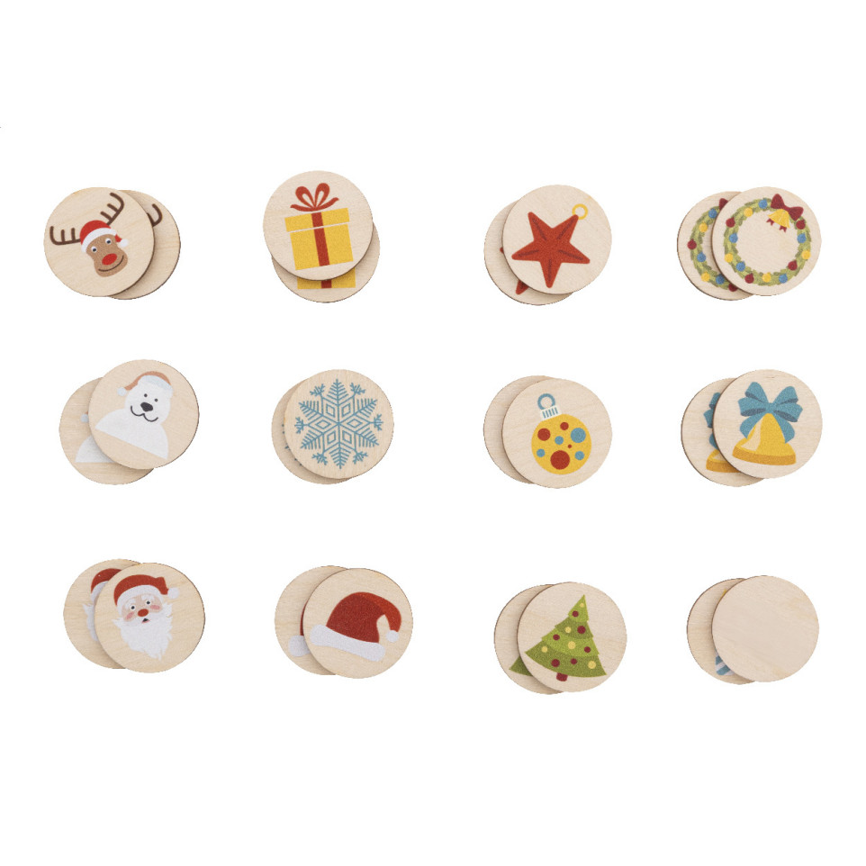 Speels en praktisch kerstgeheugenspel van Junoppi, bestaande uit 24 ronde tegels van 35 mm, vervaardigd uit gelamineerd berkenmultiplex en geleverd in een stevige katoenen draagtas. Ideaal voor families, scholen of promotionele acties rond de feestdagen.