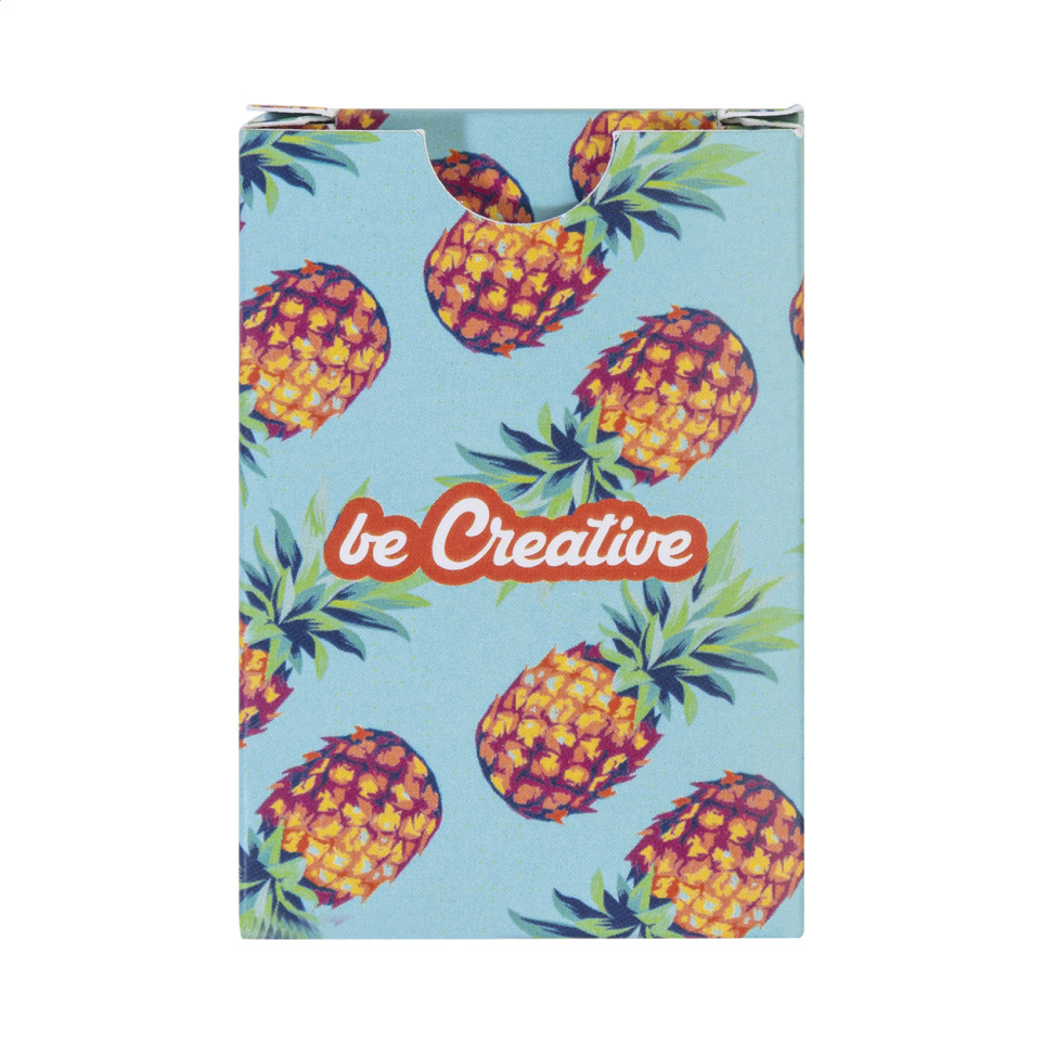 Compacte, custom made speelkaarten in mini reisformaat, verpakt in een papieren doosje. Bevat een standaard kaartspel met 54 kaarten, ideaal voor onderweg of als promotioneel cadeau.