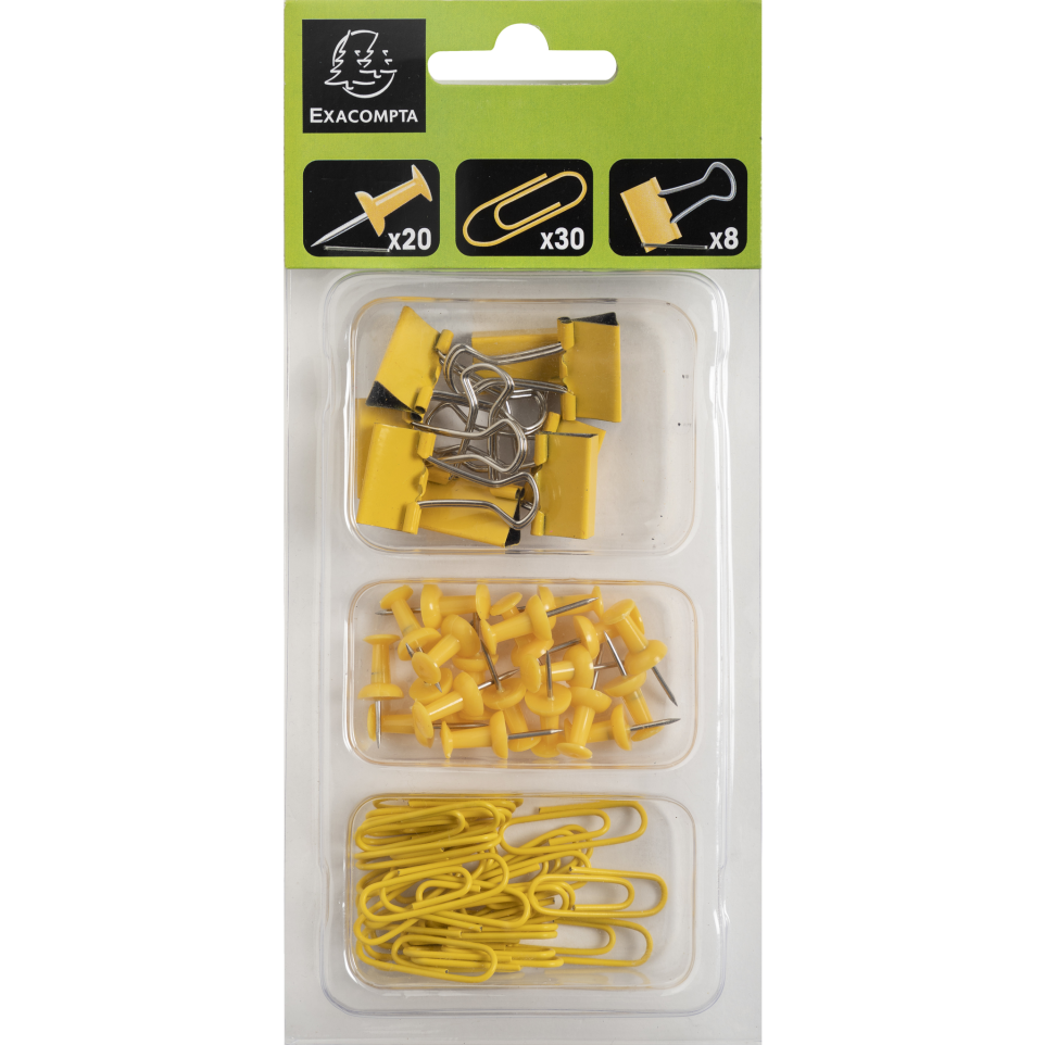 Kit 58 papierklemmen Iderama De kit is een plastic etui met 3 verdelingen, en bevat 20 push pins, 30 papierklemmen en 8 dubbele metalen clips. Een multifunctionele kit met diverse clips en pins, geschikt voor het aaneenhechten van bladen, documenten, tickets, kaarten, foto's, of het bevestigen van notities, berichten, informatie, posters op muren of borden. Zowel de paperclips als de dubbele clips zijn zeer handig, en stellen u in staat uw documenten netjes in te binden en te sorteren. Een kwalitatieve kit met clips voor vele toepassingen, op school, kantoor en thuis. Handig voor iedereen, zowel voor privé als profe ssioneel gebruik. Handige clips, in de heldere kleuren van de Iderama collectie.