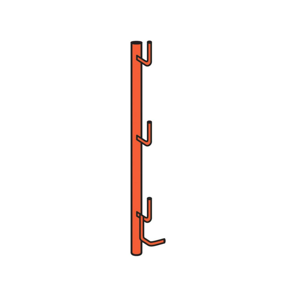De leuningstaander wordt verticaal op de stalen steiger geplaatst en bevestigd. De geïntegreerde haken maken het eenvoudig om houten panlatten of metalen leuningen snel aan te brengen, waardoor een veilige reling rondom de werkplek ontstaat.