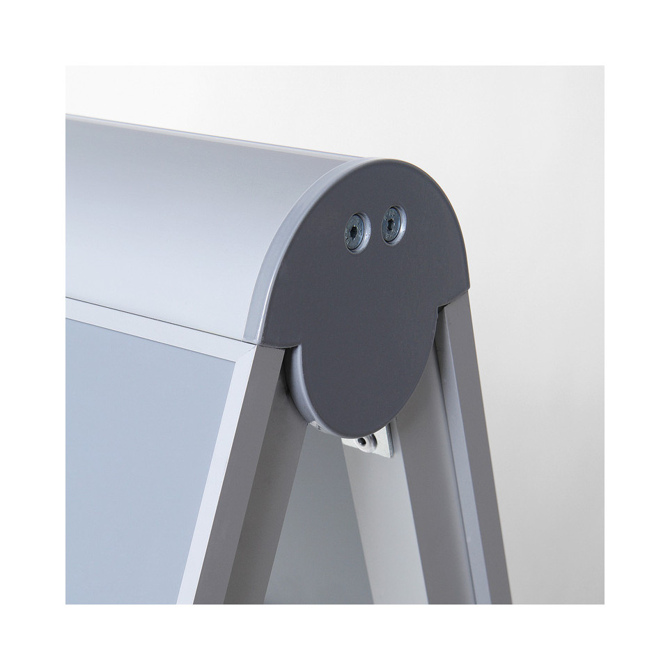 Plaats het A-bord op een strategische locatie buiten. Open de geïntegreerde kliklijst om gemakkelijk een poster te wisselen en bevestig het logo bovenaan. Dankzij het robuuste ontwerp blijft je boodschap beschermd en goed zichtbaar onder alle weersomstandigheden.