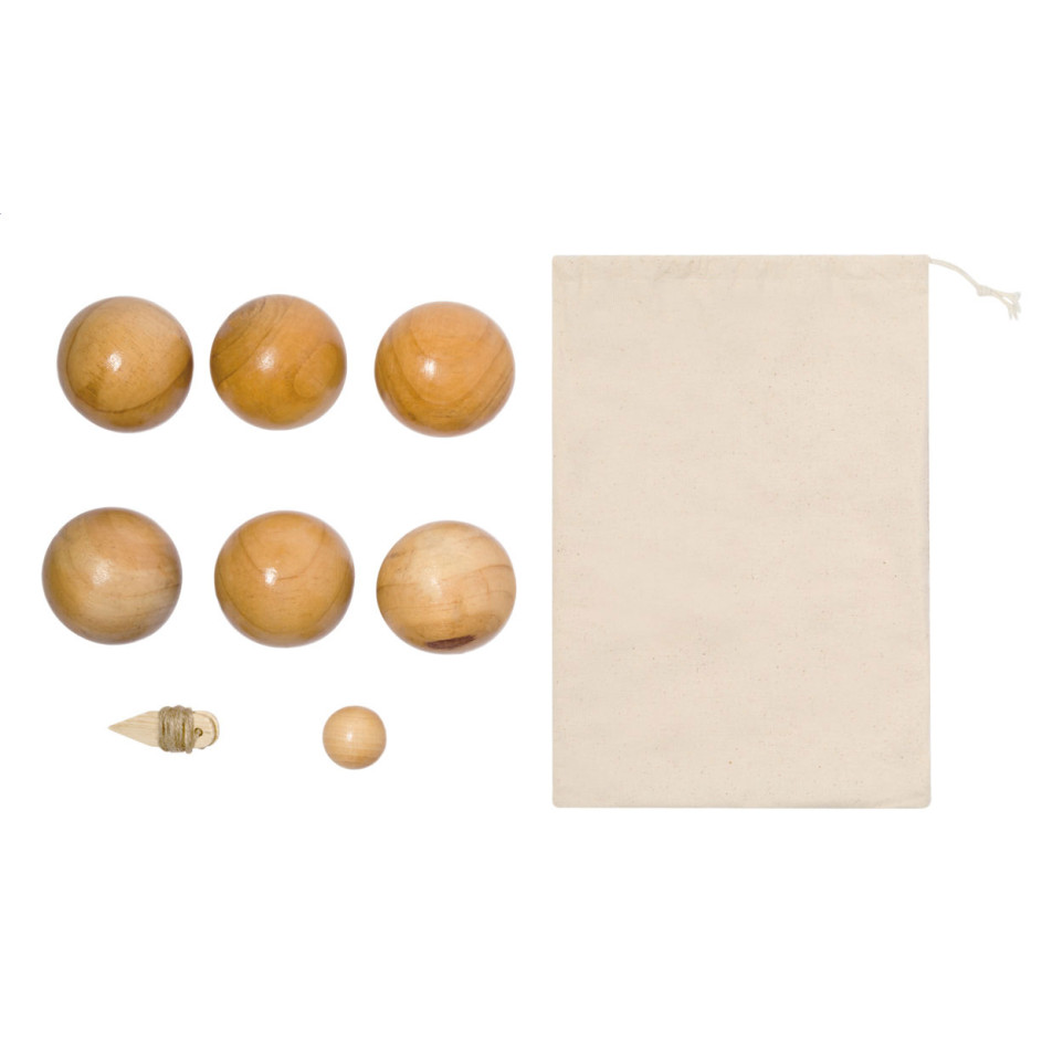 - Van welk materiaal is het petanquespel gemaakt? – Het spel is volledig vervaardigd uit hout en wordt geleverd in een katoenen opbergzak.