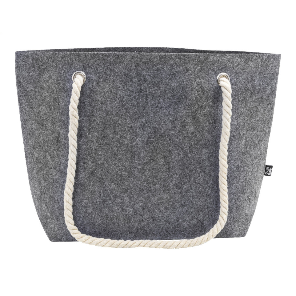 Grijze RPET vilt strand- of boodschappentas met katoenen koord handvatten en een verstevigd bodem inzetstuk. Ideaal voor een dagje strand, winkelen of zelfs dagelijks gebruik door het lichte, stevige ontwerp.