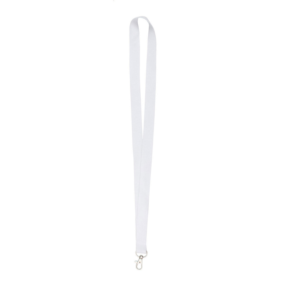 Polyester lanyard in witte kleur met metalen karabijnhaak, ideaal voor het dragen van badges, toegangspassen of sleutels tijdens evenementen, beurzen of op de werkvloer. Het praktische ontwerp vergroot het comfort en de zichtbaarheid.
