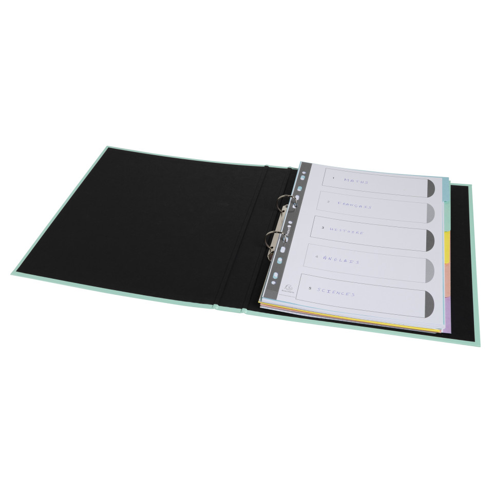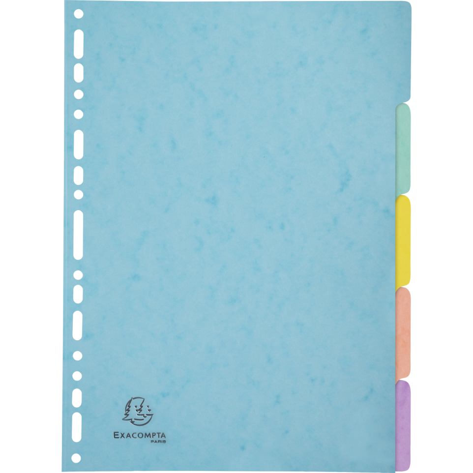 Tabbladen in glanskarton 400g/m2 Aquarel 5 verdelingen - A4 De Aquarel collectie in pastelkleuren van Exacompta, een vleugje frisheid werkt inspirerend. Deze frisheid vindt u terug in de Aquarel tabbladen in zachte kleuren, geschikt om de inhoud van een ringband of ordner overzichtelijk op te delen. Deze tabbladen in echt glanskarton van 400g/m2 zijn stevig en duurzaam. U kunt eenvoudig doorheen de verschillende vakken bladeren. Met versterkte perforatierand voor veelvuldig gebruik. De tabs zijn beschrijfbaar met pen of potlood. Zachte kleuren voor een betere leesbaarheid. De verschillende vakken kunnen ook worden aangeduid op het bijgeleverde indexblad, dat je kan personaliseren met de Kreaman toepassing op www.exacompta.com. Formaat A4, geschikt voor gebruik met geperforeerde bladen. De tabbladen steken niet uit de ringbanden of ordners. Franse productie, van grondstof tot eindproduct gemaakt in de fabrieken van Exacompta-Clairefontaine.