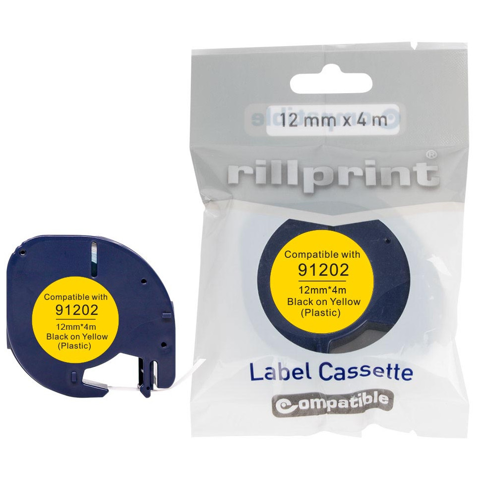 Rillprint compatible LetraTAG tape is ontworpen voor gebruik met Dymo LetraTag labelprinters. Deze gele plastic tape van 12 mm breed en 4 meter lang biedt heldere en duurzame etikettering voor thuis, kantoor of archivering van documenten.