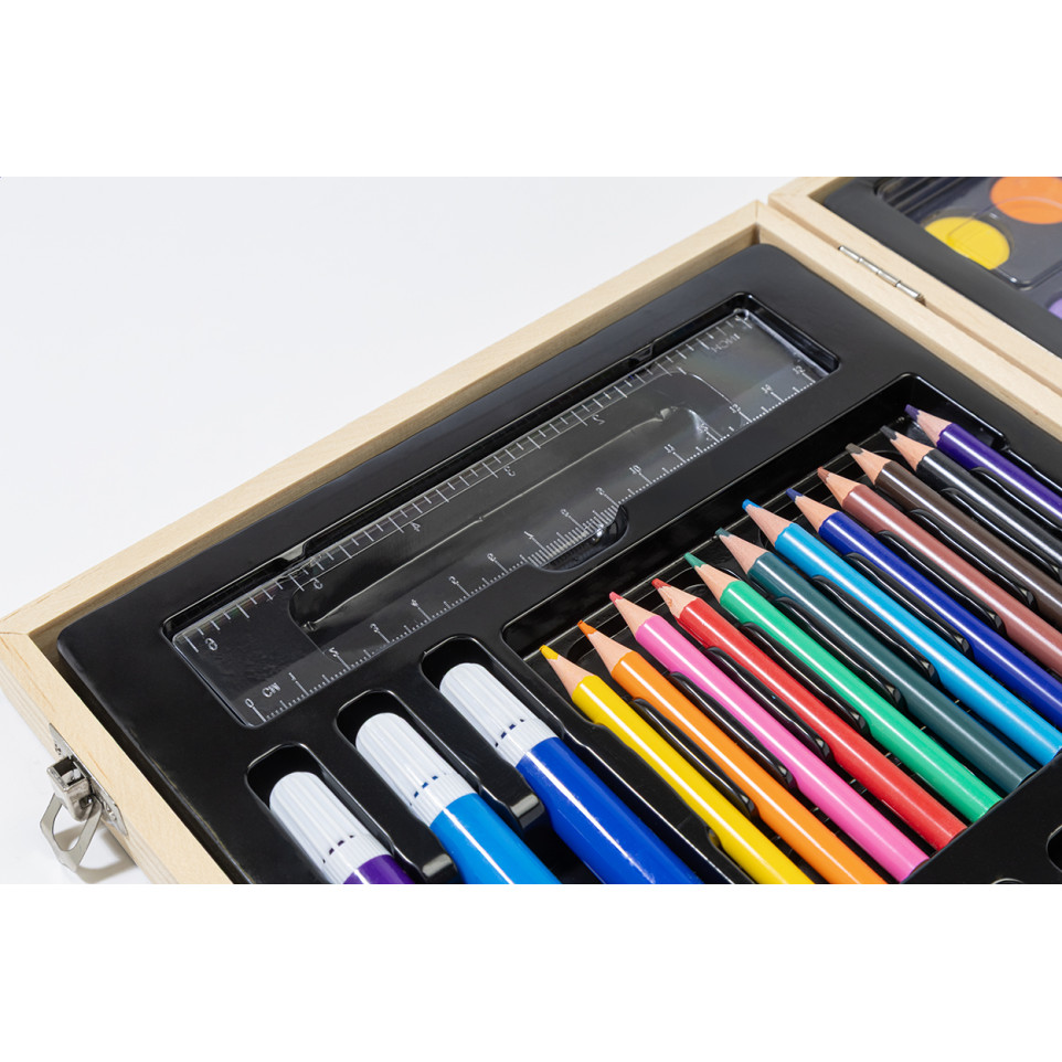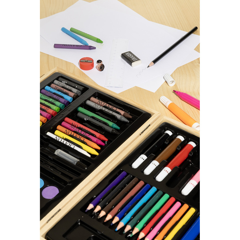 Wat zit er precies in de set? — De set omvat 12 waskrijtjes, 12 oliepastels, 12 potloden, 12 stiften, 12 aquarelverven met palet en penseel, een liniaal, gum, slijper en lijm.