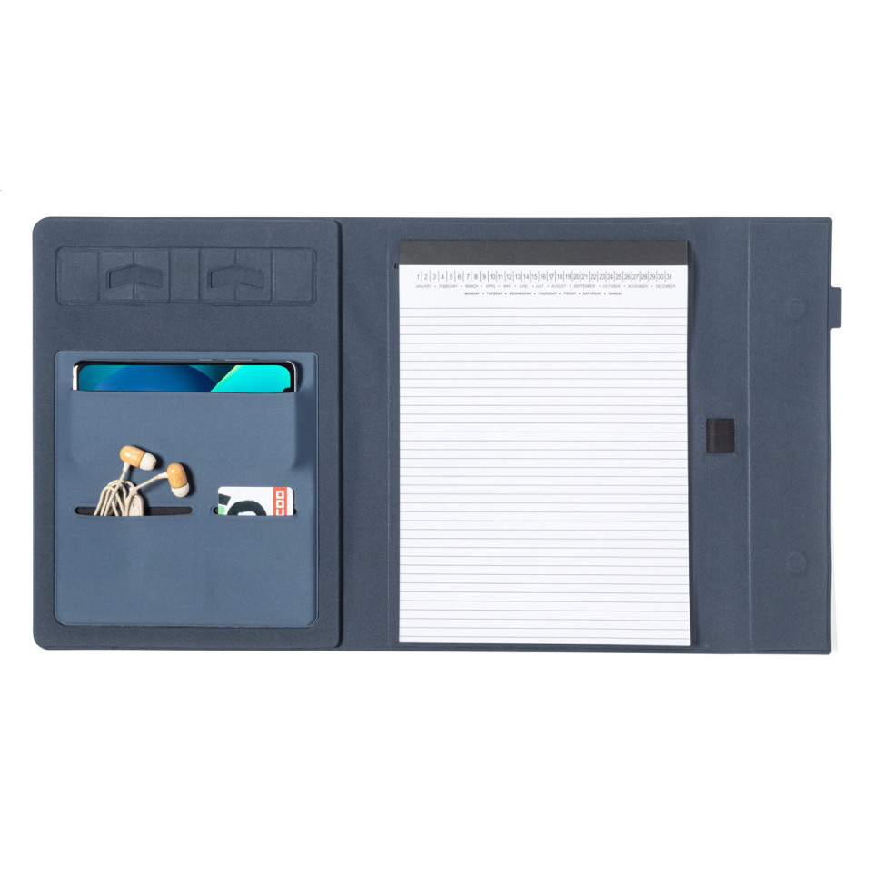 A4-formaat documentmap van 600D RPET polyester in donkerblauw met magnetische sluiting, opvouwbare telefoonhouder en geïntegreerd notitieblok met 20 gelijnde vellen. Ideaal voor professioneel gebruik tijdens vergaderingen of onderweg.