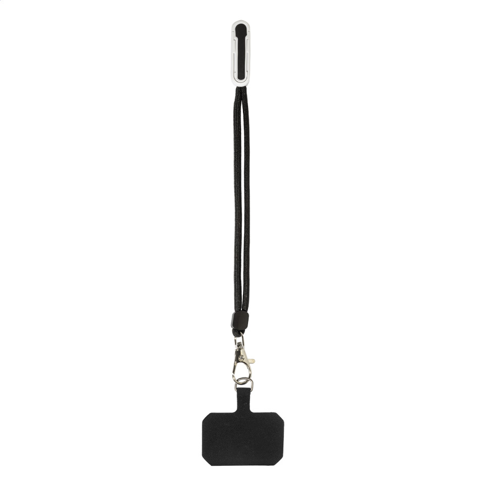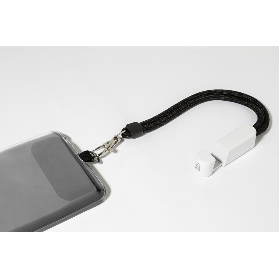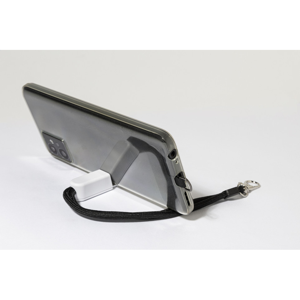 De CuffStand is een mobiele houder met polsbandje in wit, vervaardigd uit gerecycled RPET-materiaal. Hij combineert een telefooninzetstuk voor dagelijks draagcomfort met een herbruikbare ABS bureaustandaard.
