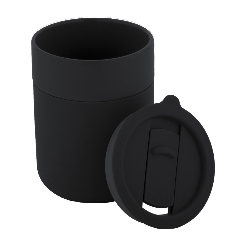 De beker combineert keramiek met een siliconen omhulsel en heeft een PP kunststof drinkdeksel.