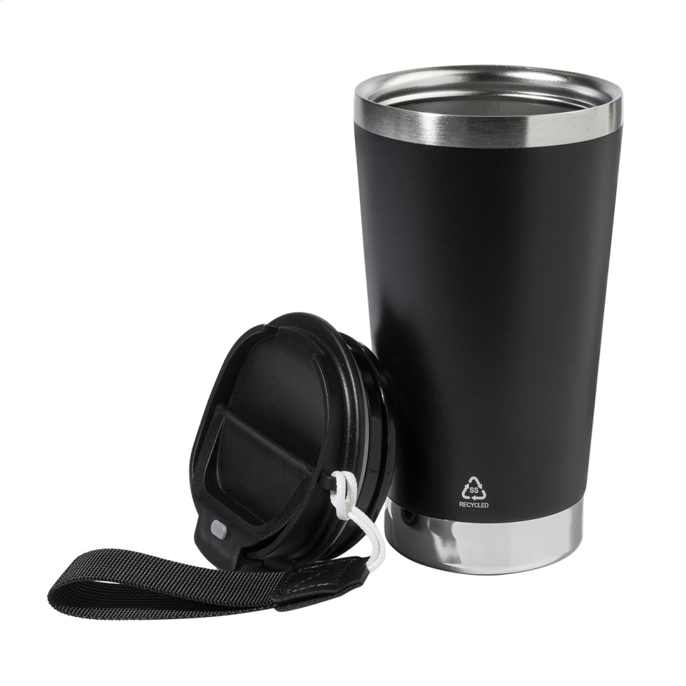De Pacama thermosbeker in stijlvol zwart is een dubbelwandige geïsoleerde beker van gerecycled roestvrij staal met een inhoud van 430 ml, voorzien van een PP-drinkdeksel en een handige draagriem.