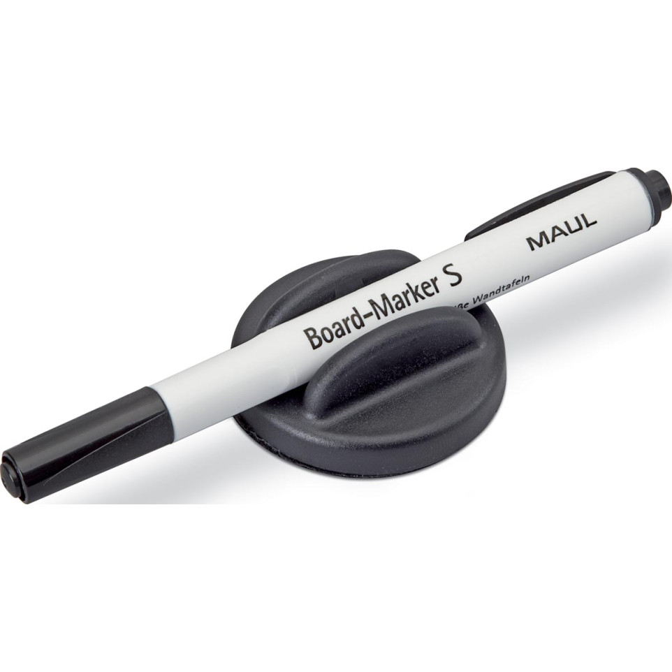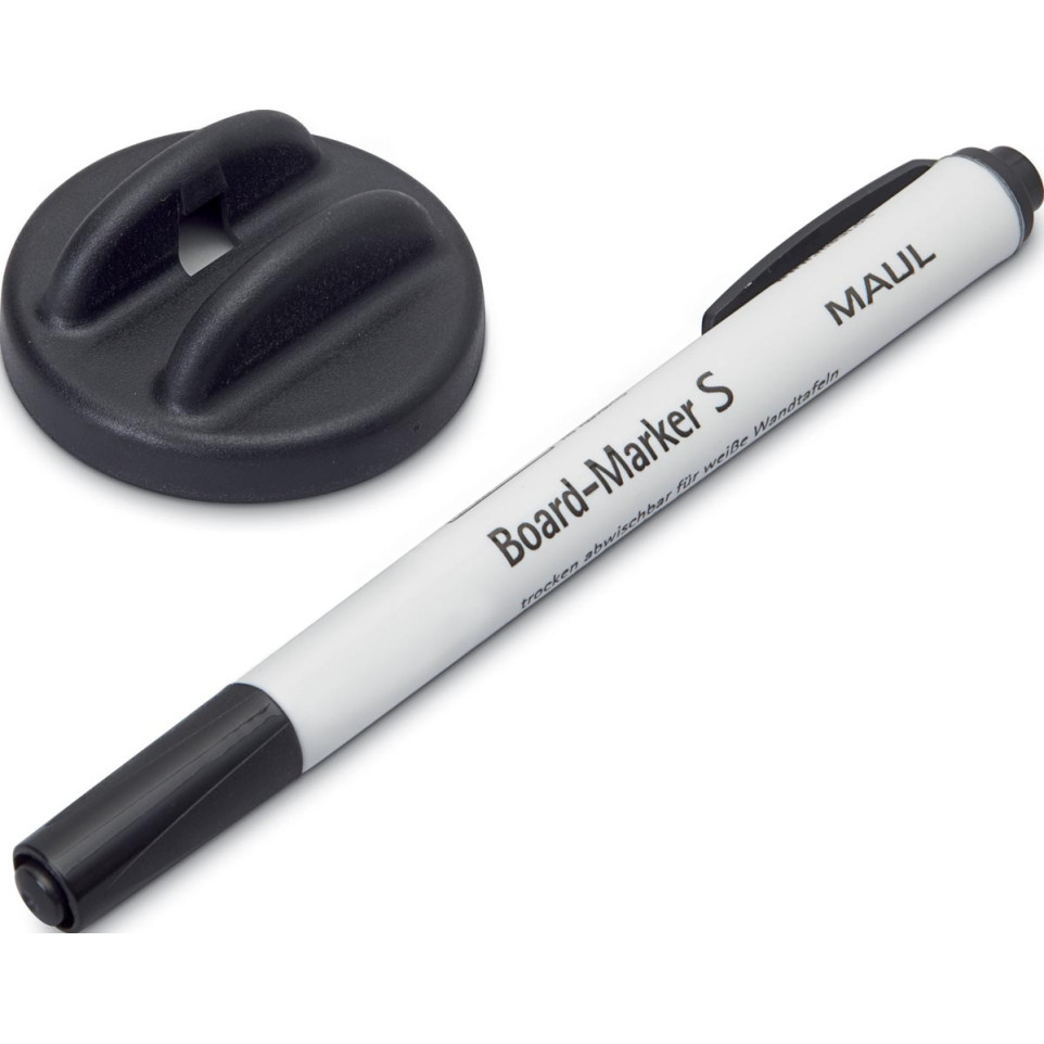 Compacte magnetische bordwisser van 5 cm diameter, zwart gelakt, inclusief een zwart witbordmarker met ronde punt (1,5–2 mm). Ideaal voor dagelijks gebruik in klaslokalen, kantoren of vergaderruimtes op whiteboards.
