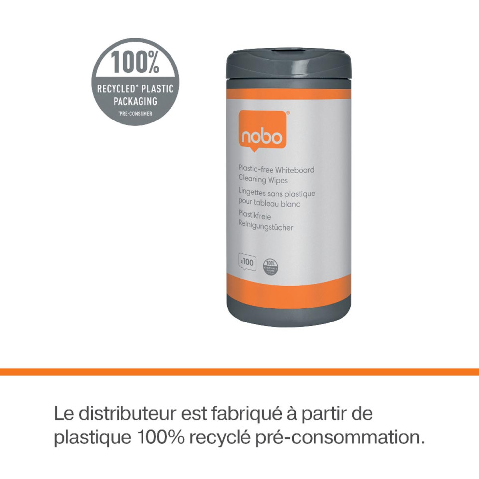Open de dispenser en neem eenvoudig een doekje dankzij de geperforeerde rand. Reinig hiermee het whiteboard of andere droog uitwisbare oppervlakken. Gebruik voor het beste resultaat samen met een Nobo whiteboardwisser. Sluit de dispenser na gebruik goed af om uitdroging te voorkomen.