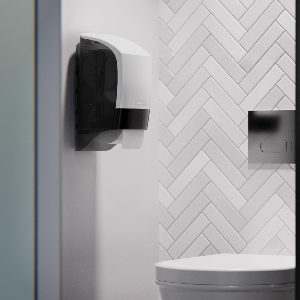De Katrin toiletpapierdispenser Inclusive biedt een praktische oplossing voor sanitaire ruimtes met een efficiënte capaciteit voor twee toiletrollen. Ideaal voor drukbezochte locaties waar doorlopende beschikbaarheid en snelle navulling essentieel zijn.