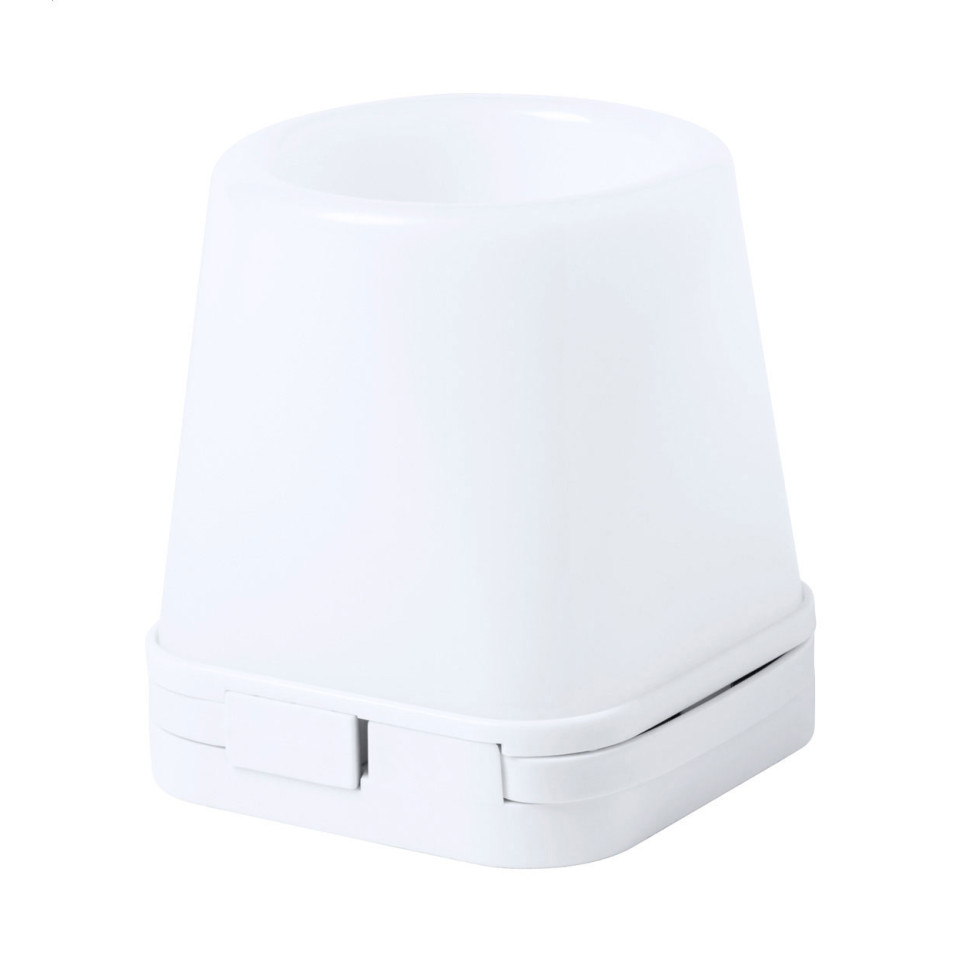 Praktische witte bureelaccessoire: kunststof pennenhouder met geïntegreerde 4-poorts USB 2.0-hub, ingebouwde mobiele telefoonhouder en vier LED-lichtjes. Ideaal voor het organiseren van schrijfwaren en digitale connectiviteit op elk bureau.