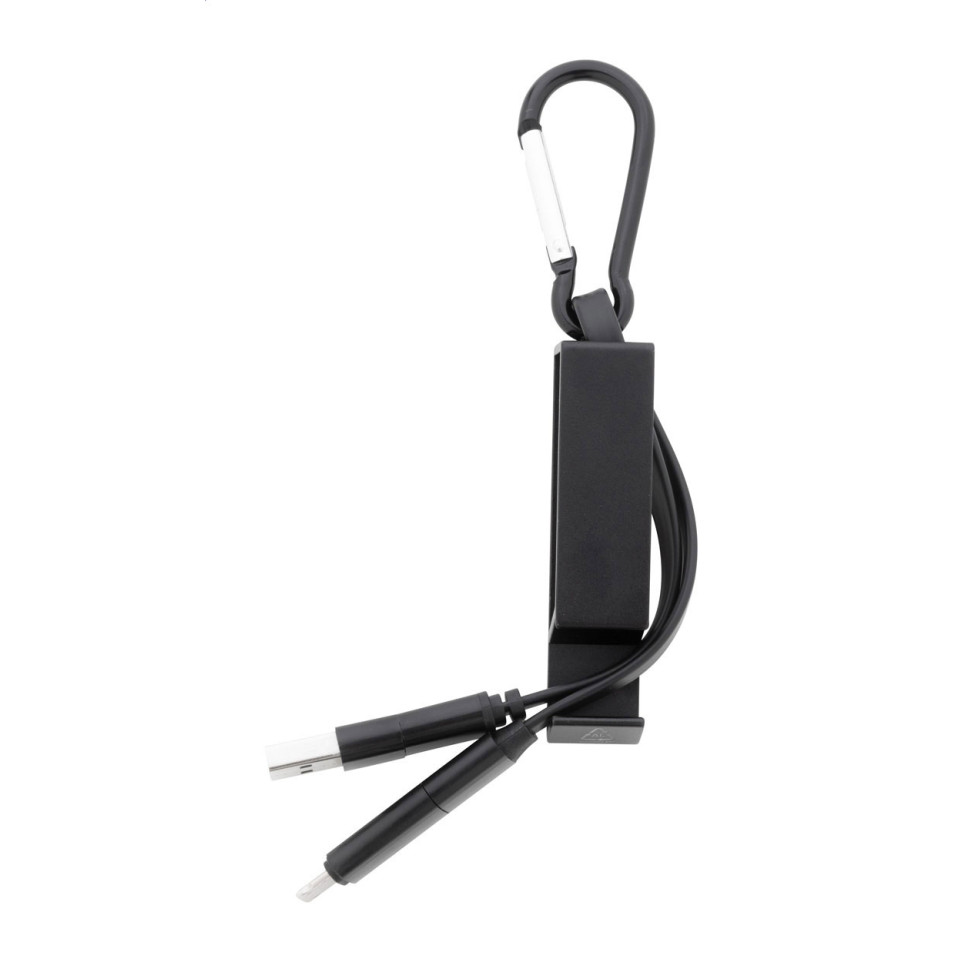 Multifunctionele zwarte USB-oplaadkabel met een duurzame karabijnhaak van gerecycled aluminium, geïntegreerde telefoonhouder en een flesopener. Geschikt voor micro USB, USB-C en Lightning apparaten; voorzien van USB en USB-C ingangen.