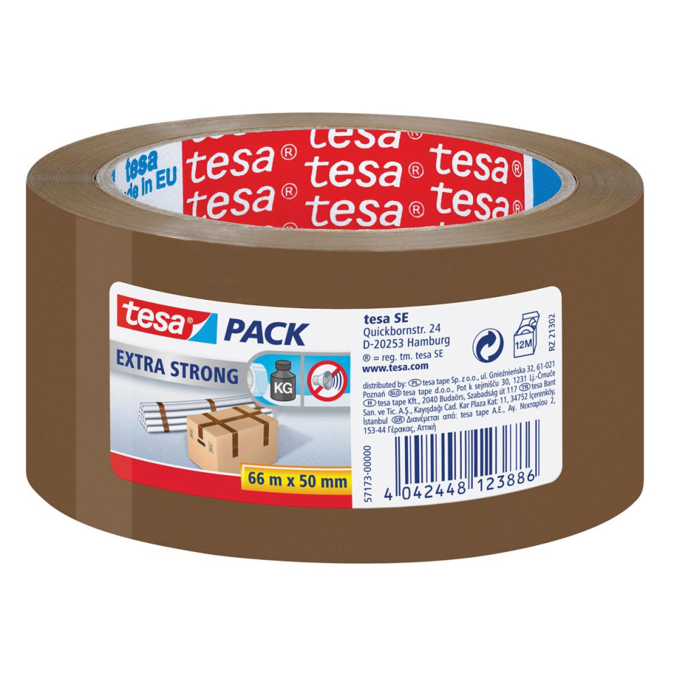 Tesa verpakkingsplakband Extra Strong is een premium verpakkingstape van 50 mm breed en 66 m lang, uitgevoerd in bruin PVC. Ontworpen voor zware en middelzware dozen, bundelen van pakketten of sluiten van enveloppen, met krachtige hechting voor professioneel gebruik.