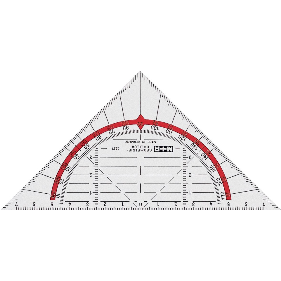 De M+R geodriehoek wordt gebruikt door de gradenmarkeringen te gebruiken om hoeken en afstanden te meten. Het is eenvoudig om de hoek te lezen door de gradenmarkeringen te volgen. Deze geodriehoek is perfect voor het maken van schetsen en tekeningen in verschillende toepassingen.