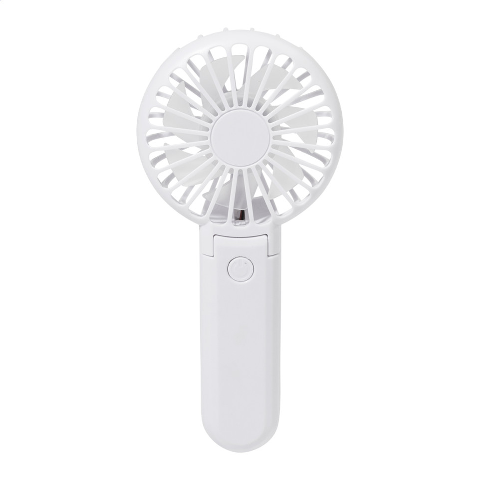 Compacte elektrische handventilator vervaardigd uit gerecycled ABS, uitgerust met een ingebouwde oplaadbare batterij. Ideaal voor persoonlijk gebruik onderweg, op kantoor of bij buitenactiviteiten.