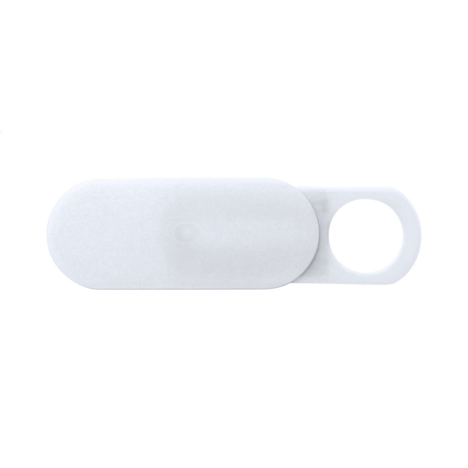 Compacte, witte webcam blocker van kunststof met schuifbare cover en zelfklevende achterkant. Ontworpen om eenvoudig op laptops, tablets en monitors te bevestigen voor optimale privacybescherming op kantoor of thuis.
